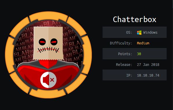 Chatterbox was a reasonably simple machine which required exploiting a vulnerable ‘Achat’ service with custom shellcode, and then migrating to a more stable ...
